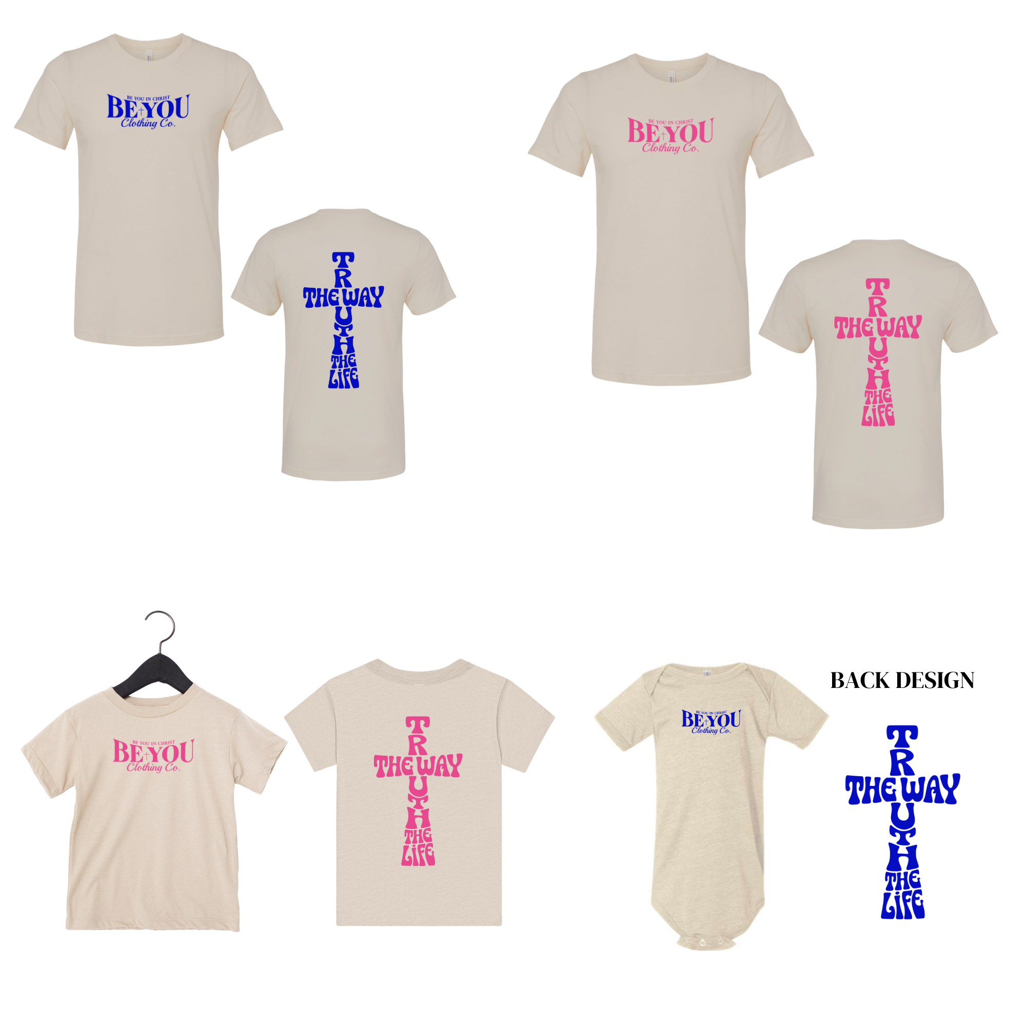 Inspired by John 14:6 “I am the way, the truth, and the life” this design serves as a daily reminder that Jesus is the center of it all. Featuring a bold cross layout on the back with the words The Way. The Truth. The Life. and a classic Be You Clothing Co. logo on the front, these tees are designed to make a quiet but powerful statement wherever your family goes.